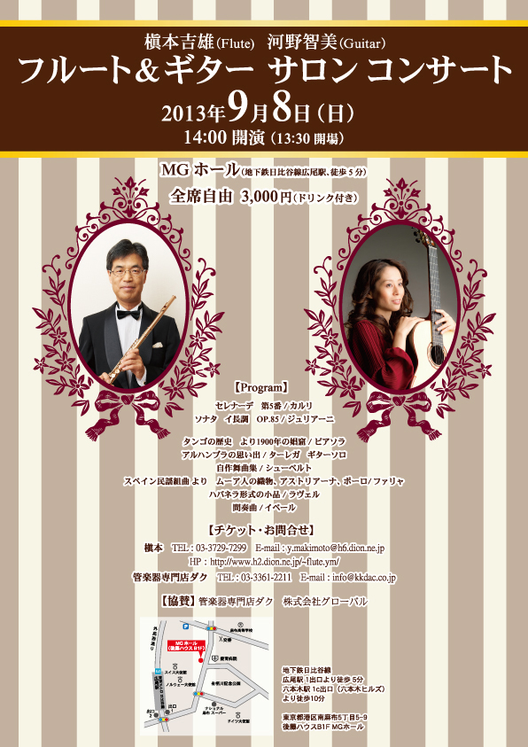 2013年9月8日(日)、広尾のMGホールでギタリストの河野智美さんと初めてのデュオコンサートを開催しました。