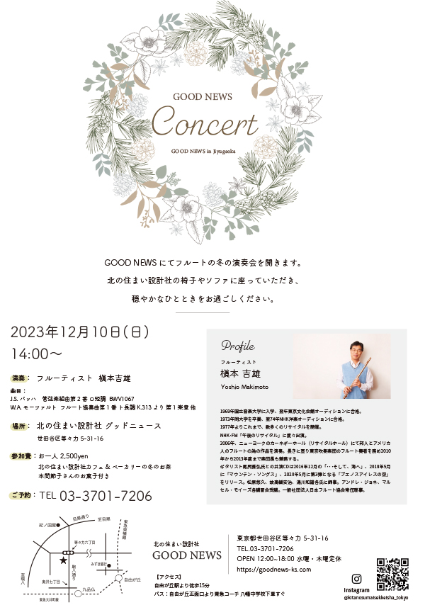 北海道東川町(旭川近郊)の家具や生活雑貨を扱う「北の住まい設計社グッドニュース」の東京ショールームでコンサートに出演します。 ショールームは九品仏駅から徒歩9分、自由が丘駅から徒歩15分の世田谷区の閑静な住宅地にあります。 自由が丘からバスもありますので詳細はチラシをご覧下さい。 今回で3回目となりますが、木の家具とフルートの響きが調和する素敵な空間でソロの演奏です。 北の住まい設計社のソファーや椅子に座りながらフルートの音色をお楽しみ下さい。